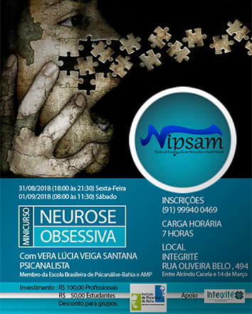 O Núcleo de Investigação em Psicanálise e Saúde Mental convida para o Minicurso Neurose Obsessiva, ministrado pela querida psicanalista Vera Lúcia Veiga Santana, membro da Escola Brasileira de Psicanálise - Bahia e Associação Mundial de Psicanálise.