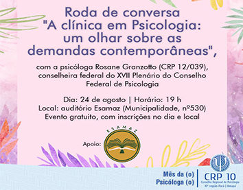 Com o tema “Clínica em Psicologia: um olhar sobre as demandas contemporâneas”, uma roda de conversa vai ser realizada pelo Conselho Regional de Psicologia 10ª Região Pará/Amapá (CRP10), no próximo dia 24 de agosto, às 19h, no auditório da Escola Superior da Amazônia (Esamaz), na Municipalidade, nº 530, em Belém.