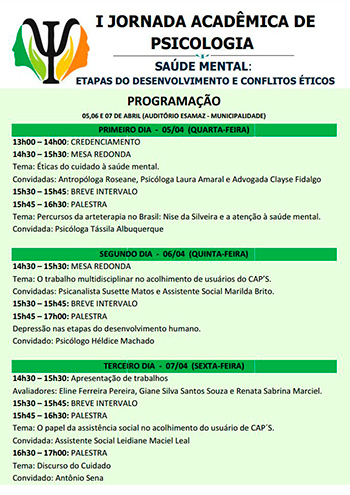 O Núcleo de Investigação em Psicanálise e Saúde Mental - NIPSAM, que tem a coordenação das psicanalistas Vera Santanna e Nazaré Mangabeira e como membros Laura Amaral, Valéria Soares, Susette Matos, Paula Ribeiro, Joyce Konno e Fabíola Araújo, comemora seus 10 anos de funcionamento, promovendo evento em Belém com o tema da psicanálise e saúde mental.